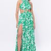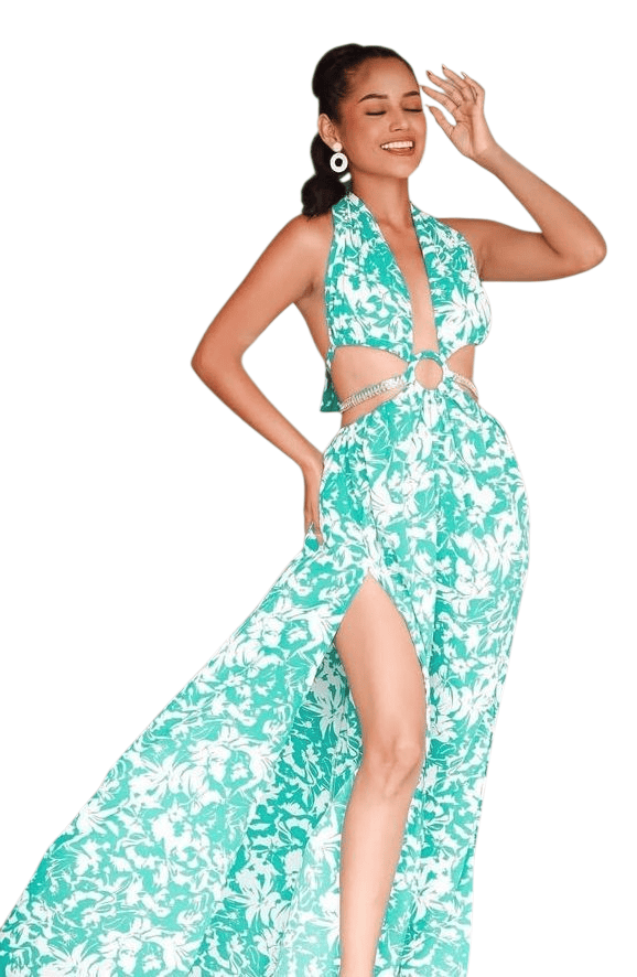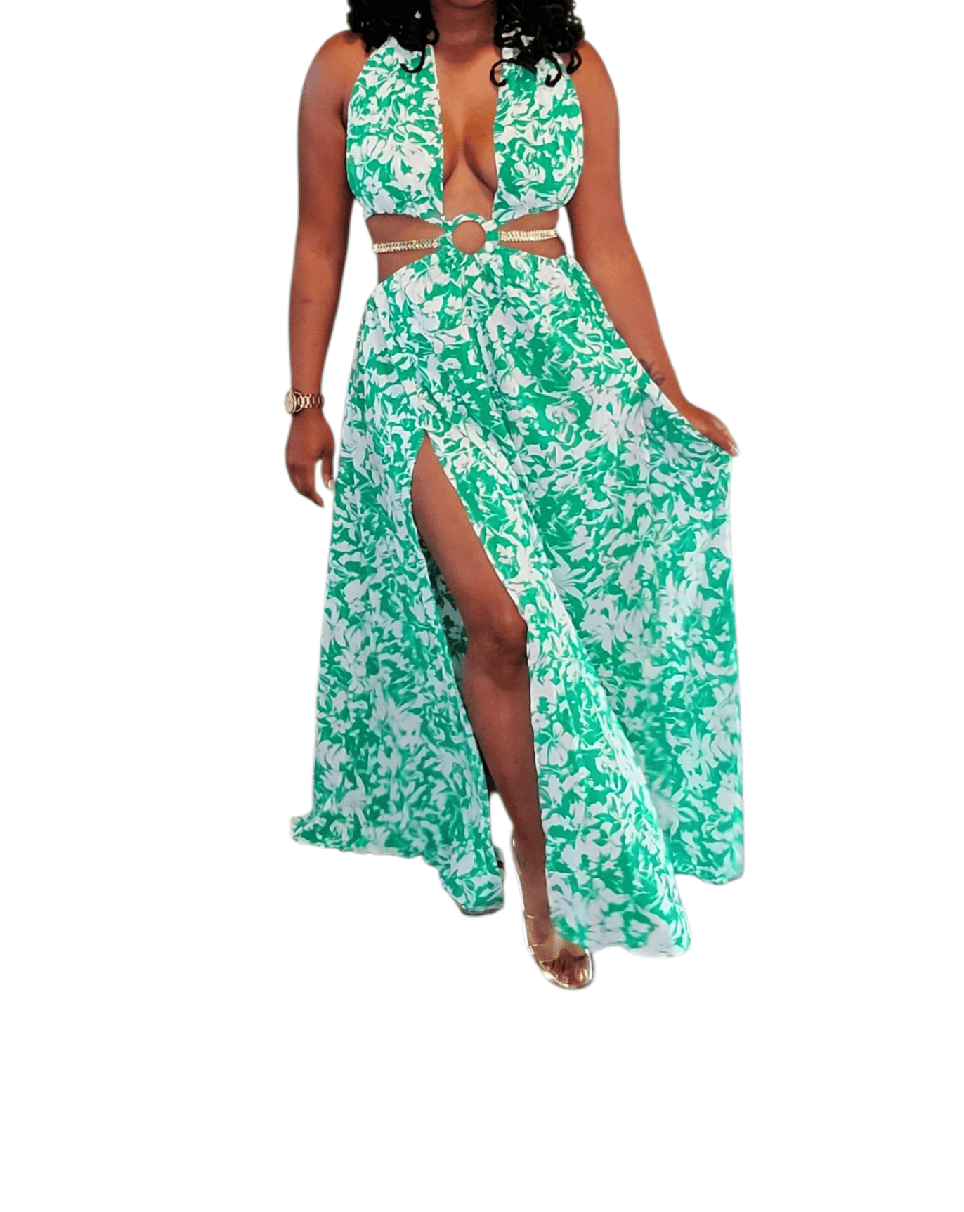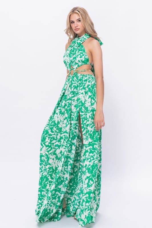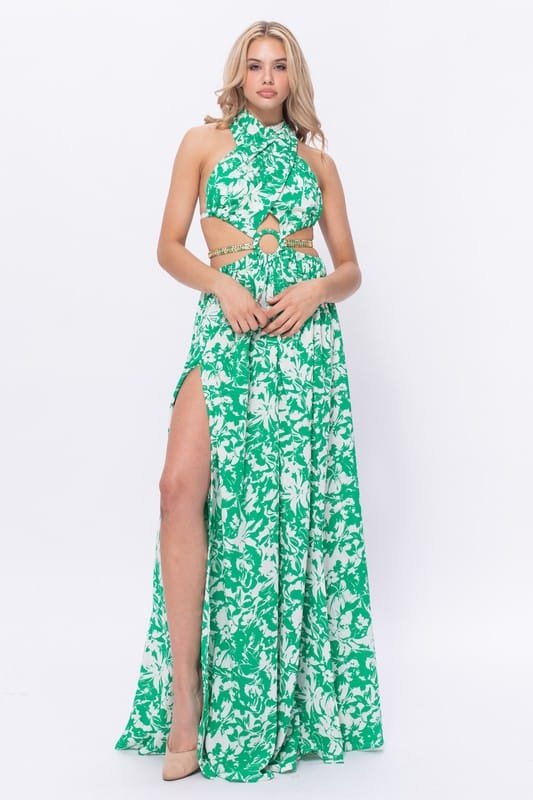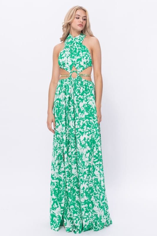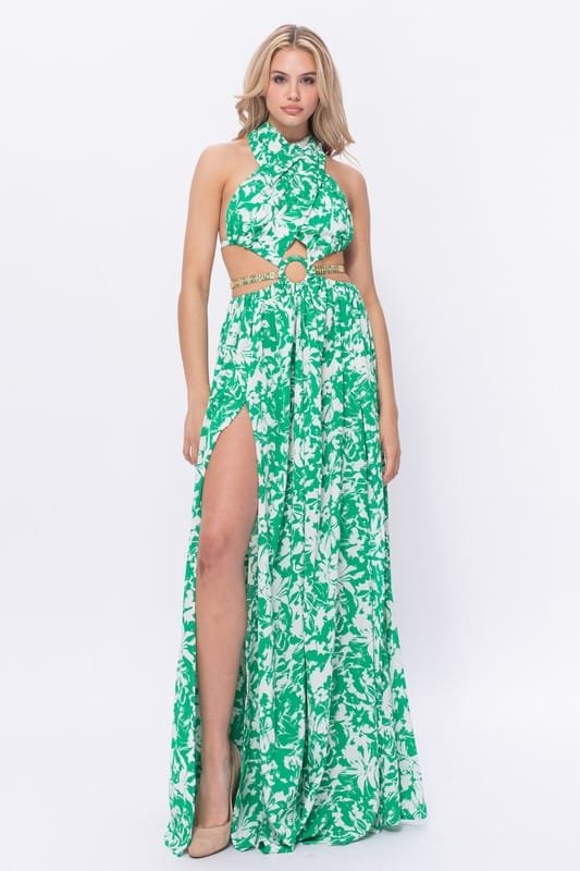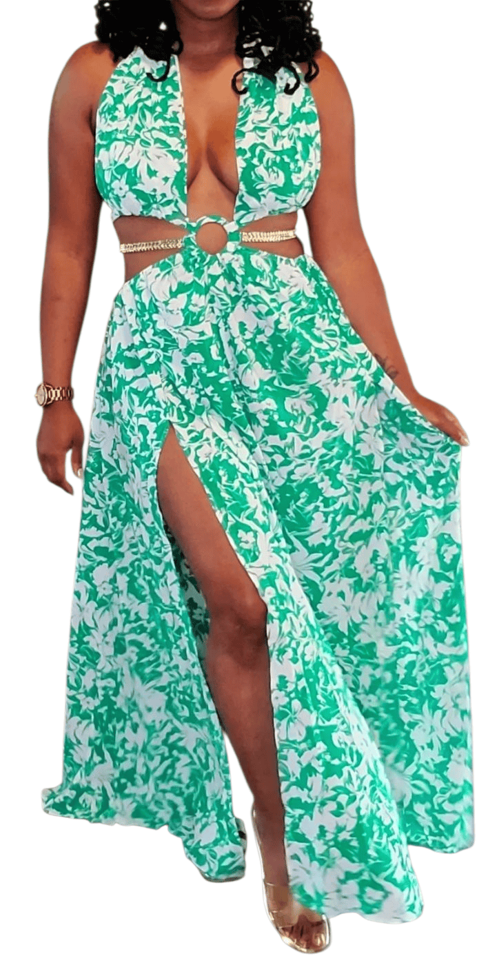 Own the spotlight in this bold emerald floral cutout dress featuring a daring front ring detail, luxe side slits, and gold chain accents that hug your curves just right. Glamour meets tropical heat!